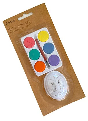 Måla dina ägg färgglada i påsk med hjälp av detta äggmålarset. Förpackningen innehåller 6 stycken vattenlösliga färger (röd, gul, grön, blå, orange, lila), en liten pensel och 4 stycken olika mallar med fina mönster.