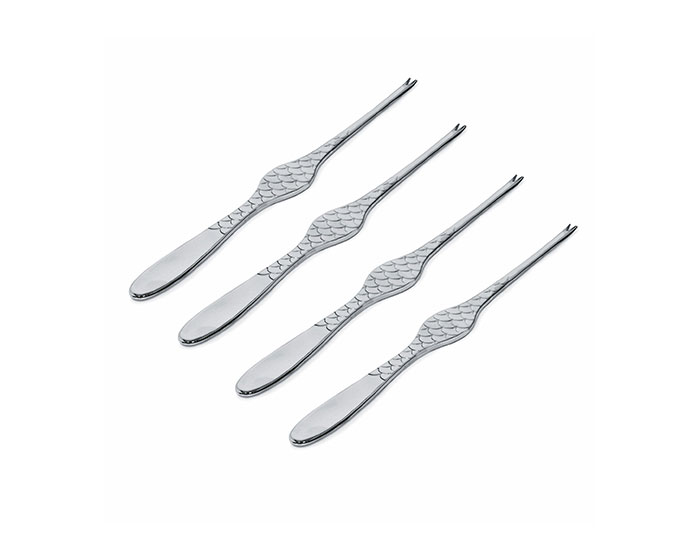 Skaldjursbestick från Alessis serie Colombiana Collection. Handtagen har en speciell struktur, inspirerad av fiskens fjäll. Ett inspirerande vackert mönster.