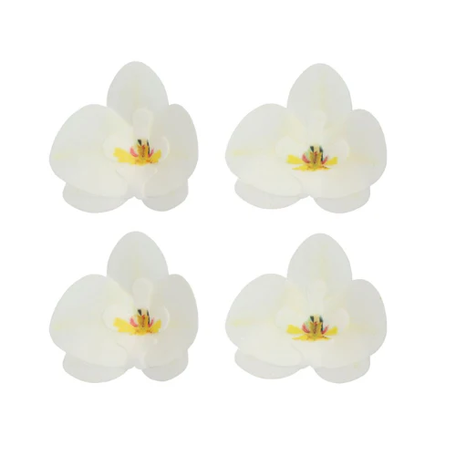 Som nyutslagna orkidéer i porslinsvitt vilar dessa ätbara waferblommor på ditt bakverk och skapar ett uttryck av stillsam elegans och tidlös skönhet. Den rena vita färgen ger en exklusiv och harmonisk känsla som passar lika bra till klassiska som moderna tårtor.
