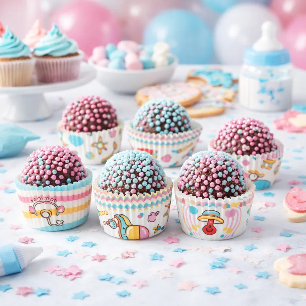 De här små bakformarna är lekfulla, mjuka i färgerna och fulla av glädje – perfekta när du vill baka något extra fint till baby shower, gender reveal eller ett första kalas fyllt av förväntan. Formarna fungerar lika bra i ugnen som till servering, och lyfter mini-cupcakes, chokladbollar, praliner eller cake pops till något som känns genomtänkt och kärleksfullt. Det är den där lilla detaljen som gör att ditt bakverk inte bara smakar gott, utan också får hjärtat att le.