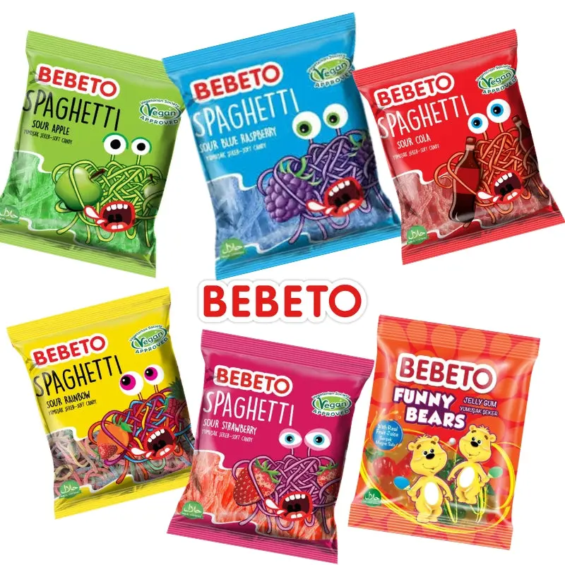 BEBETO Spagetti Sour Rainbow: En färgsprakande blandning av surt godis som kombinerar flera fruktiga smaker i en enda spagetti-godbit. Perfekt för dig som vill ha en mångfald av smaker på en gång.
