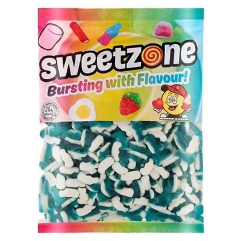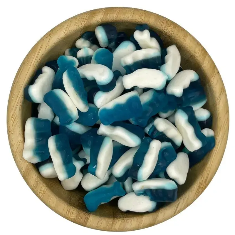 Blå delfiner. Vita och blå minidelfiner av gelé med härliga fruktsmaker.