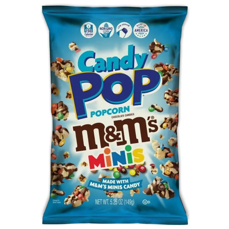 Candy Pop Popcorn M&M Minis är popcorn som kommer glaserade och täckta i bitar av M&Ms chocolate 🙂