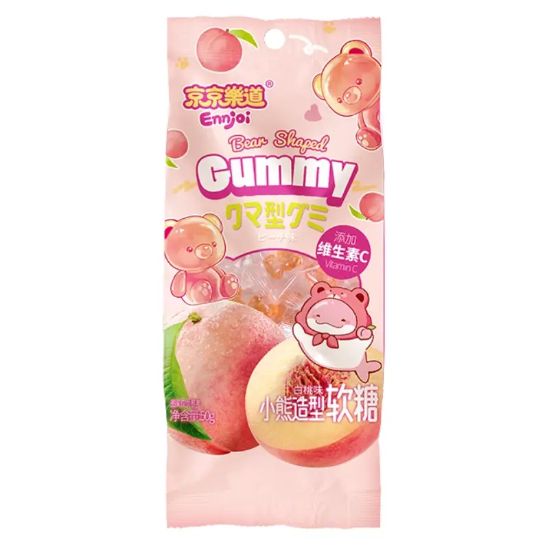 ENNJOI Bear Shaped Gummy White Peach Flavor 50g är söta och mjuka gelégodisar i björnform med en fruktig smak av vit persika. Förpackningen är både söt och praktisk – perfekt för både barn och vuxna som älskar asiatiskt godis med en twist!