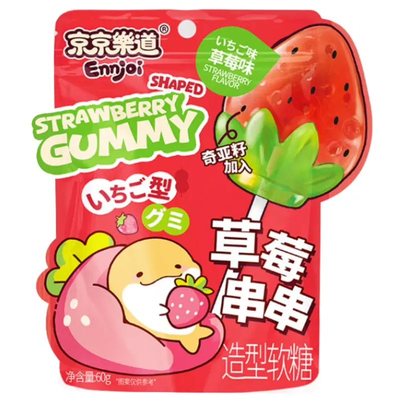 ENNJOI Strawberry Shaped Gummy Flavour 60g är ett färgglatt och lekfullt gelégodis format som små jordgubbar, med en intensiv och fruktig jordgubbssmak. Perfekt för barn, kawaii-fans och alla som älskar asiatiska sötsaker med en charmig design.
