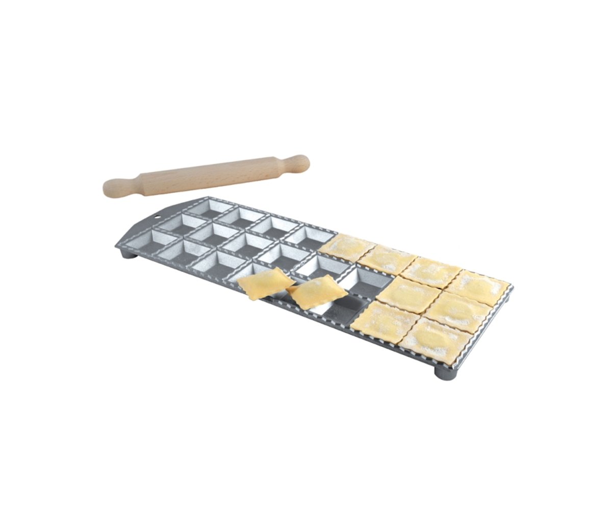 Ravioliform från Eppicotispai med 24 fyrkantiga (47 x47 mm) hål i aulminium med en kavel av hållbart bokträ.