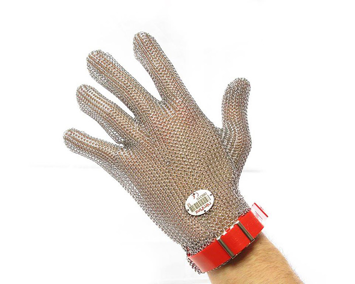 Skyddshandske i rostfritt stål som skyddar händerna vid grova köksarbeten.