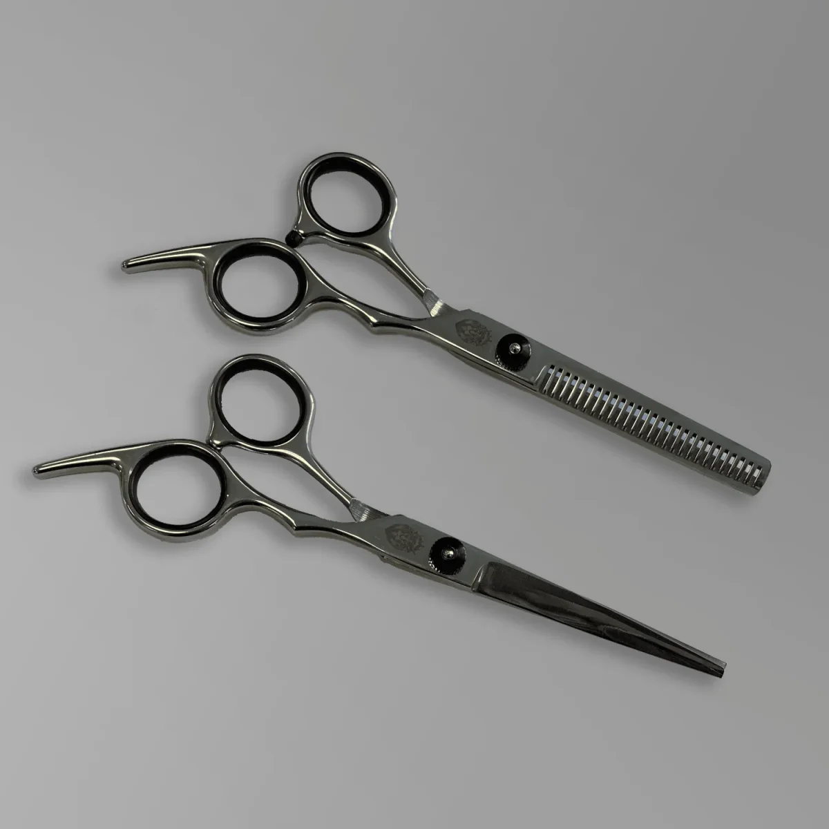 Skäggkungens logga finns även ingraverad på saxarna. Effileringssaxen fungerar utmärkt när du vill göra tjockt skägg tunnare, och Groomingsaxen hjälper dig att ta bort ojämn längd på skägget.