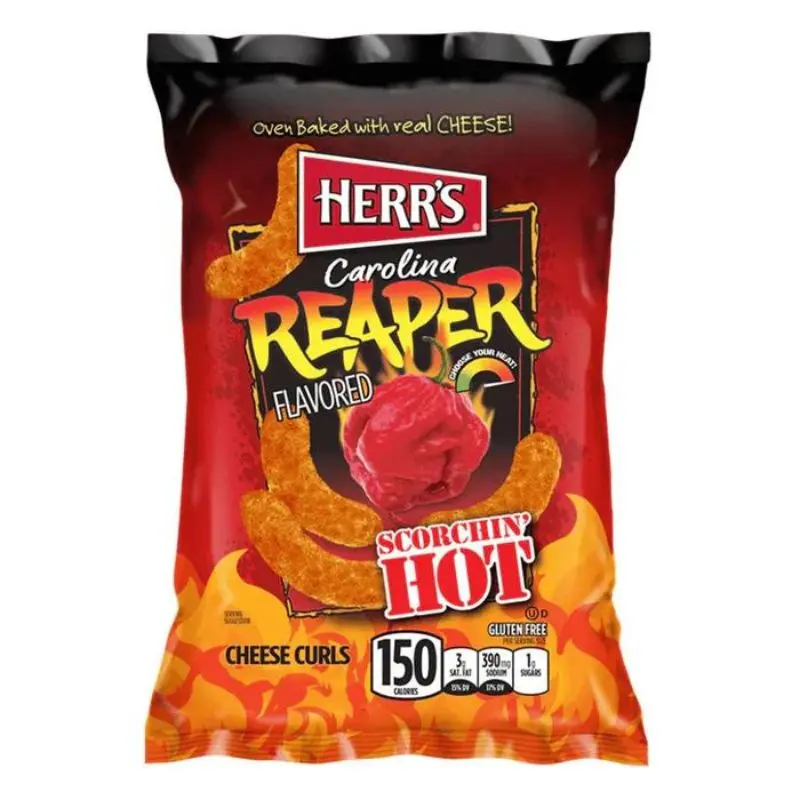 Herr´s Carolina Reaper Cheese Curls 28g är inte för den känslige! Denna ostsnack är smaksatt med världens hetaste chili – Carolina Reaper – vilket ger dig en eldigt stark och kryddig upplevelse som får smaklökarna att jubla (eller gråta!).