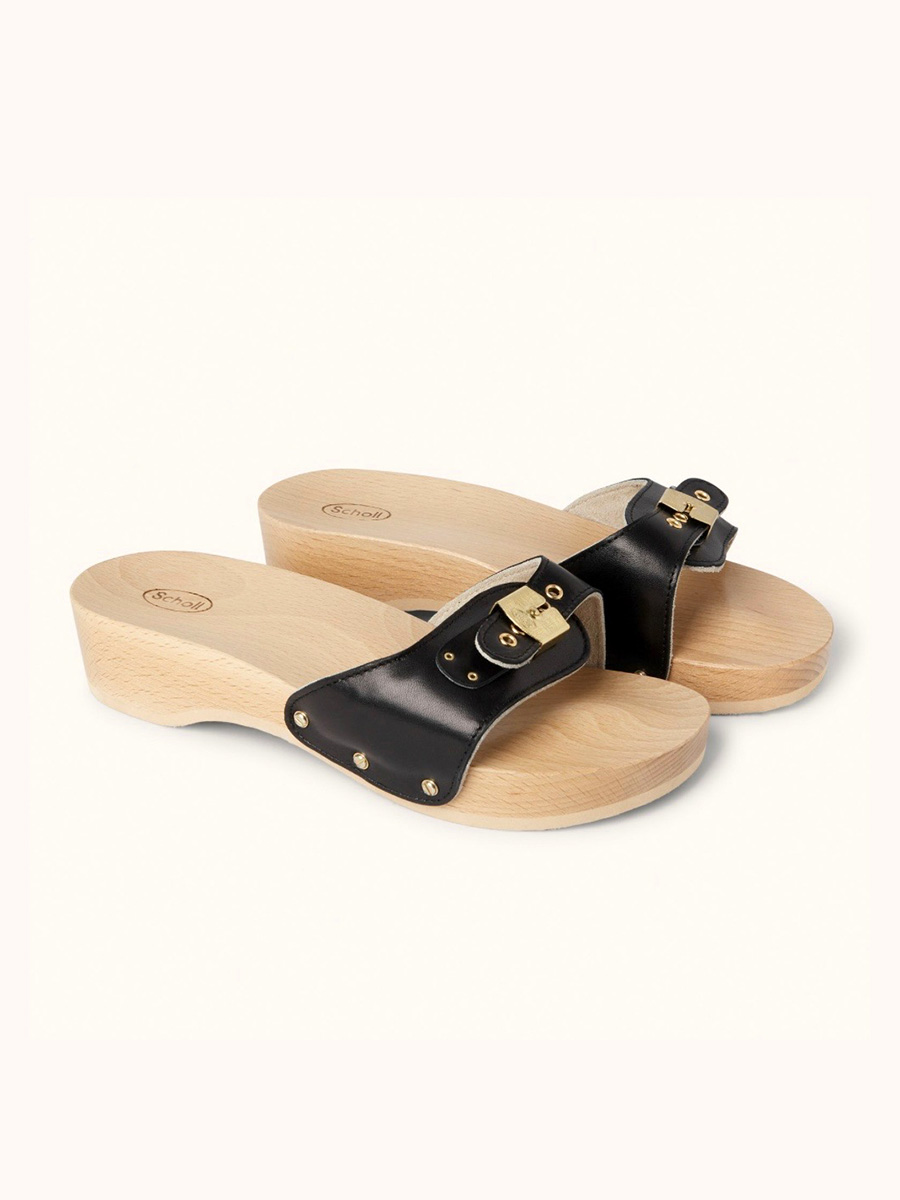 Pescura heel shoes är ett par träskor från Scholl iconic. Modellen är designad och tillverkad i Italien med en justerbar läderrem framtill, platt sula och liten klack. En klassisk sko som fungerar lika bra att bära till fest som till vardags.