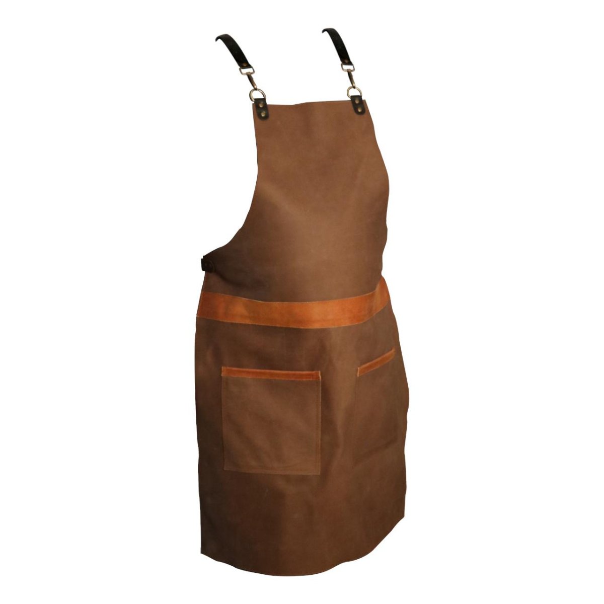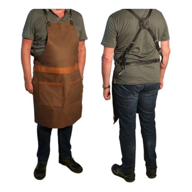 Detta rustika förkläde är tillverkat av kraftigt buffelskinn där de bästa delarna av skinnet skurits ut i en överdel och en underdel som sammanfogats med en icke synlig söm under midjebältet. På förklädet finns två praktiska fickor för förvaring samt handduk. Tillhörande hängslen med ryggkors gör förklädet följsamt och bekvämt att bära.