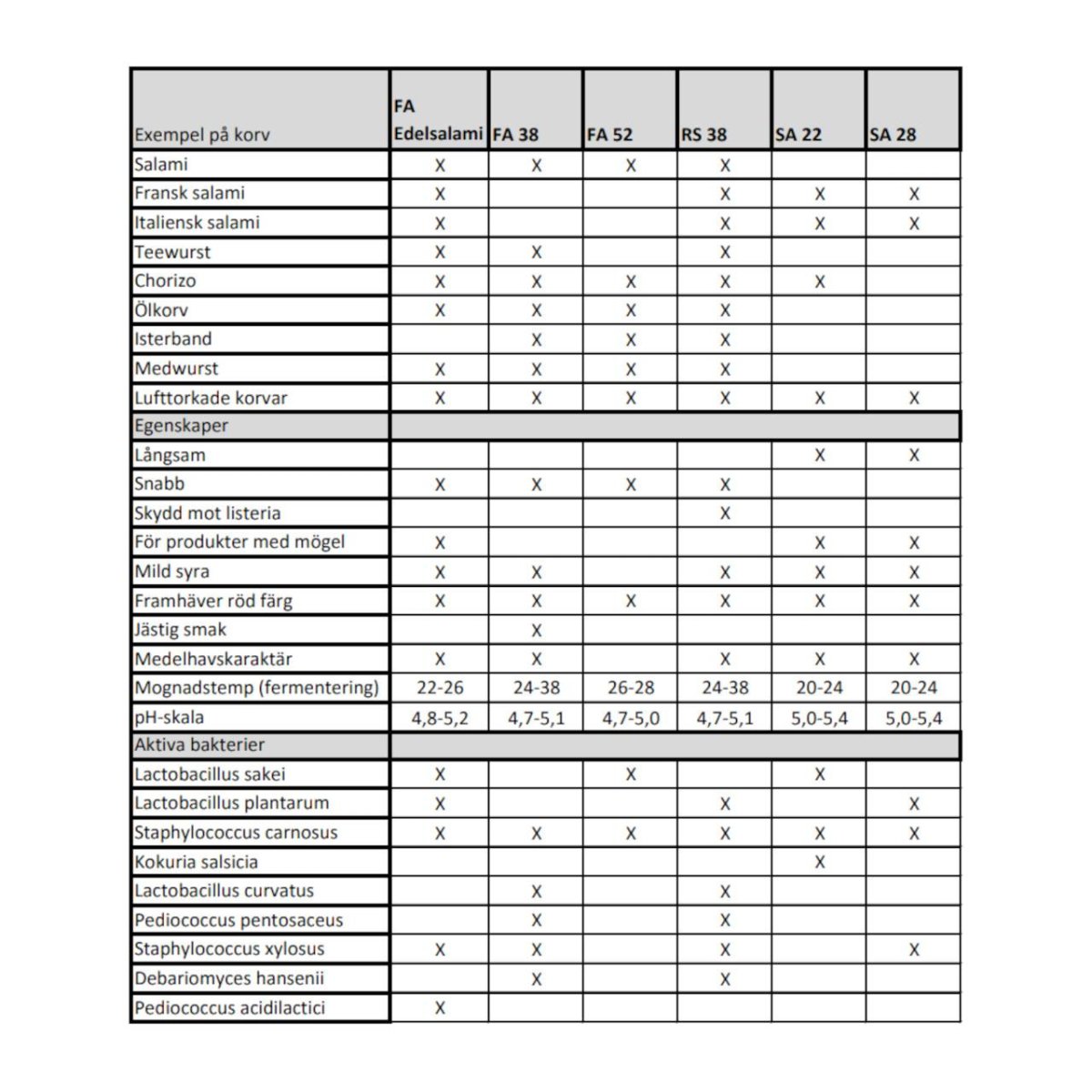 Salami / Lufttorkat / Kallrökt / Snabb kultur / Röd färg / Karakteristisk smak / Mild syra / Skydd mot Listeria