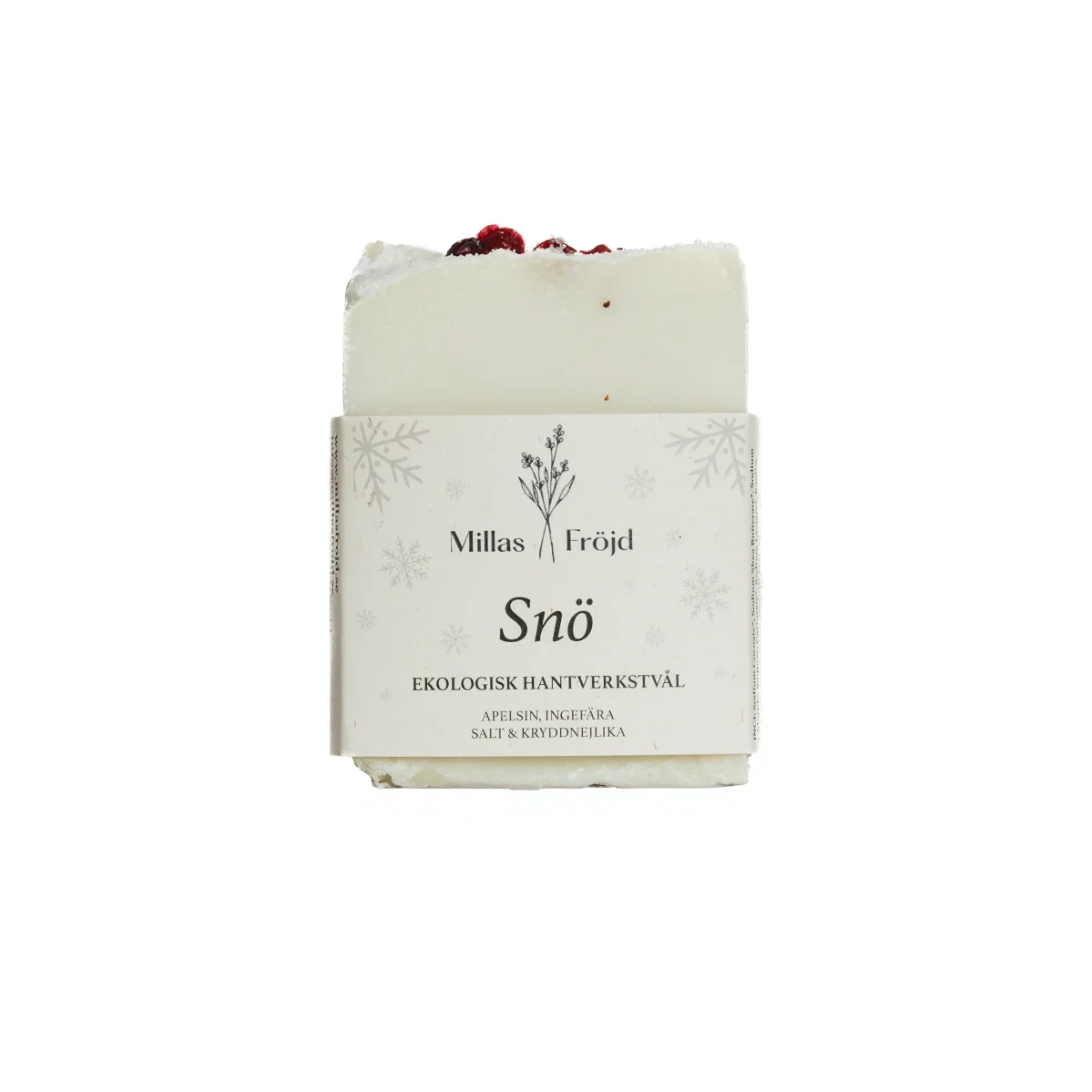 Saltet ovanpå föreställer snö, precis som tvålens namn. Ekologiska frystorkade lingon på toppen för extra julig känsla är endast för dekoration och ramlar bort efter några tvättar.