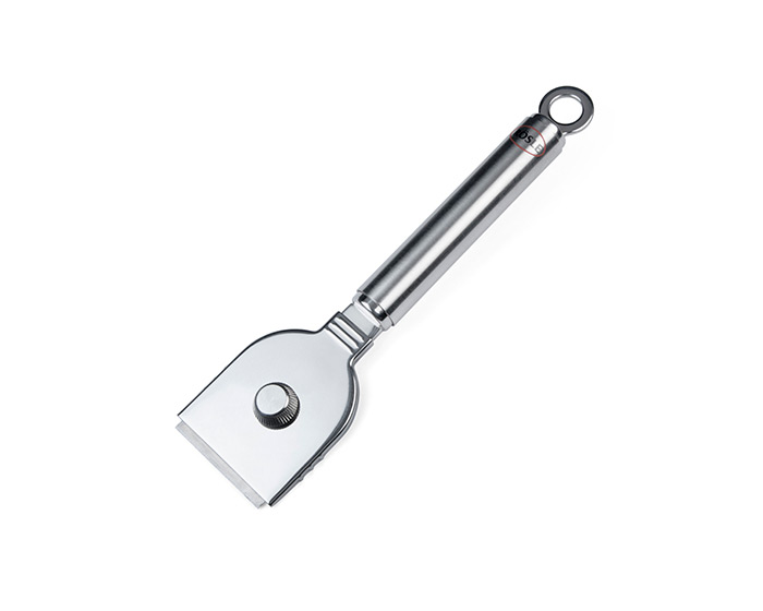 Med skrapan av rostfritt stål från RÖSLE, kan du enkelt ta bort fastbrända matrester från spisplattan. Skrapans blad kan skjutas in / ut och därmed garanteras en säker förvaring i kökslådan.