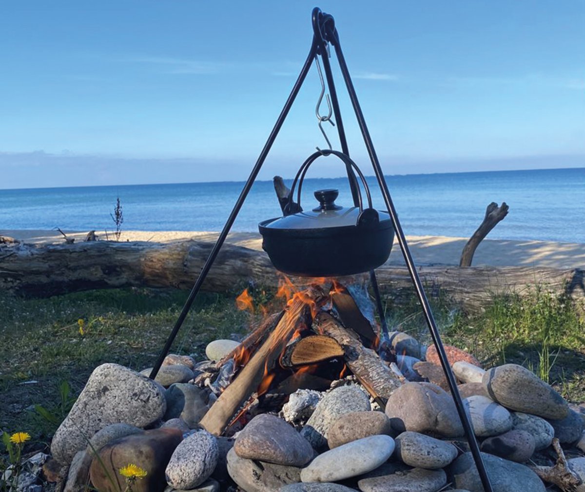 Stabila järnben som enkelt fälls ut och bildar en ställning över en eldgrop i marken. En kätting med krok ingår för att hänga en gryta/dutch oven. (Denna tripod är inte kompatibel med grillgaller.)