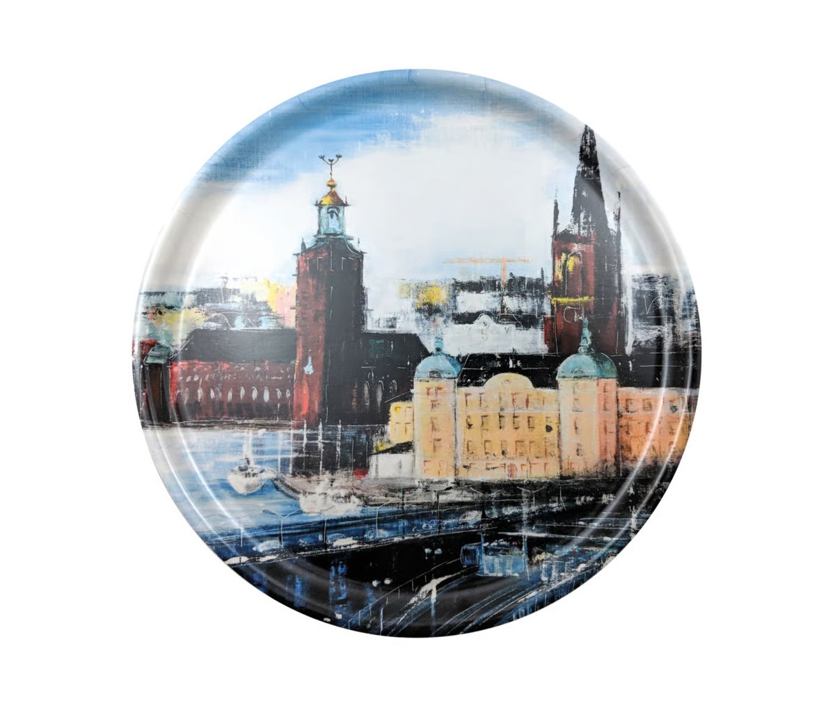 Bricka tillverkad av björkfanér med ett vackert motiv över Stockholm. Brickan mäter 35 cm i diameter. Design av Anna Linderholm.