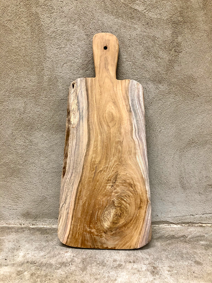 Skärbräda i obehandlad trä. Fin att ha som ost och charkbricka. Varför inte att skära på:-) eller servera ett gott surdegsbröd. Skärbrädan är även fin att hänga direkt på väggen. Alla skärbrädor är handgjorda och därför förekommer ojämnheter och olikheter. Olivolja eller rapsolja passar fint att behandla den med. Det tycker den om!