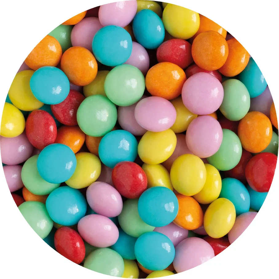 Låt dina bakverk kläs i regnbågens alla färger och av ljuvligt krämig choklad! Dessa färgglada chokladpärlor redo att förvandla allt från cupcakes och kakor till tårtor och desserter till små konstverk. Med sin lena smak av 60% mjölkchoklad och sin glansiga yta blir de lika goda att äta som de är vackra att se på. Perfekta för att strö direkt över glasyr, frosting eller choklad – eller varför inte fylla små skålar på ett dessertbord och låta gästerna toppa sina egna bakelser? Varje pärla bjuder på en härlig kontrast mellan krispig yta och krämig chokladkärna. Ett enkelt sätt att sätta färg och glädje på varje tillfälle!