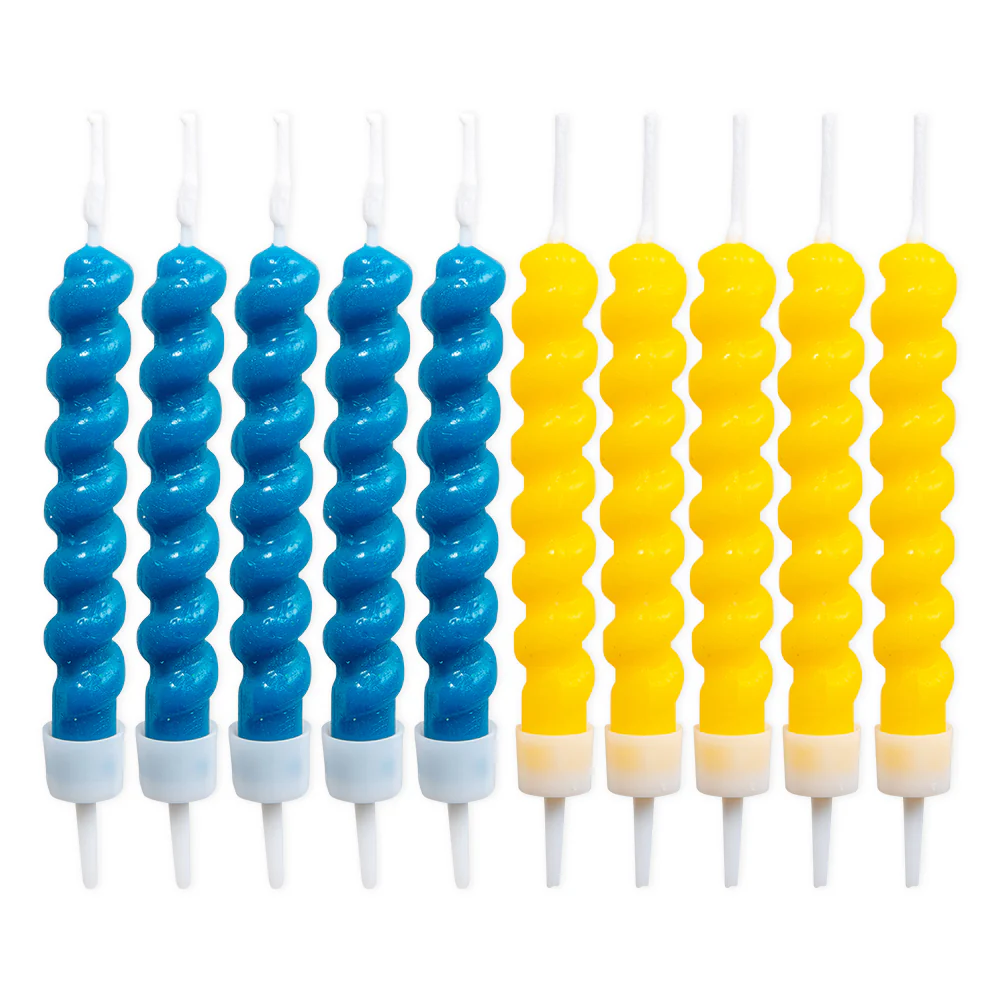 Fira studenten, födelsedagen, midsommar eller nationaldagen med dessa underbara blå och gula tårtljus! Med en charmig, tvinnad form och vackra färger ger de en festlig känsla till ditt firande. Perfekta för studentmottagningar, skolavslutningar eller sommarfester! Tårtljusen är enkla att använda och sitter stadigt tack vare sina vita hållare.