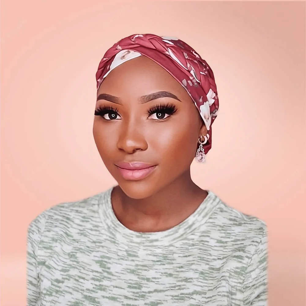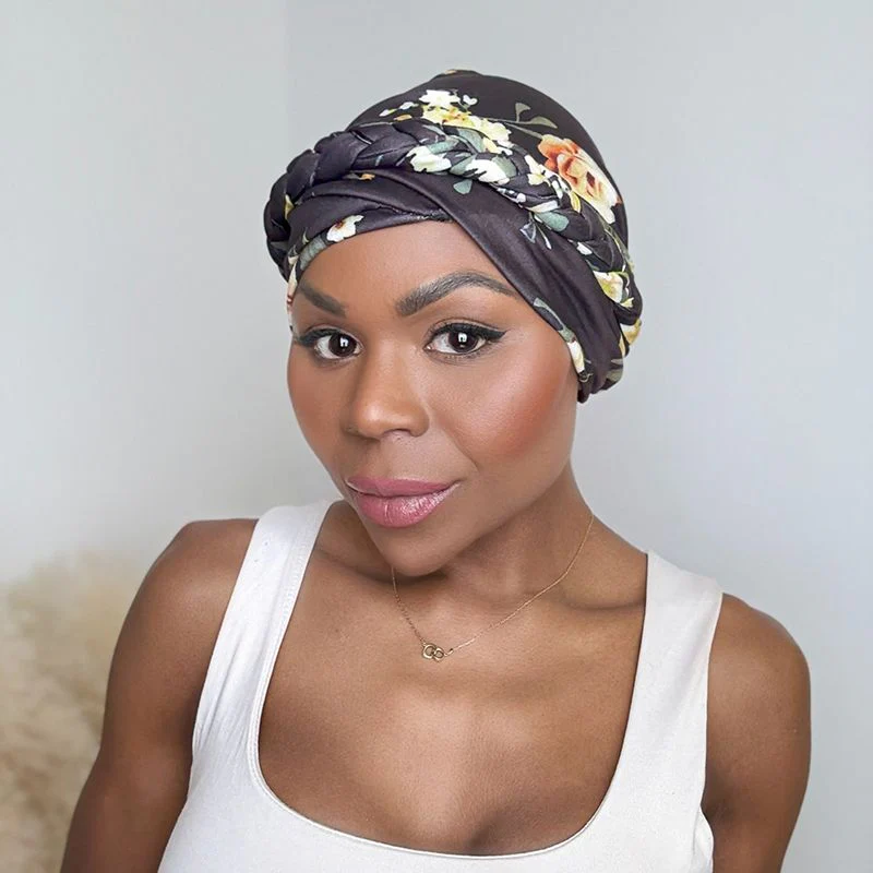 En turban med fläta är också ett mjukt och praktiskt alternativ till peruk. Den passar särskilt bra vid håravfall, till exempel vid alopeci eller under cancerbehandling, när du vill ha full täckning och en trygg, elegant känsla.