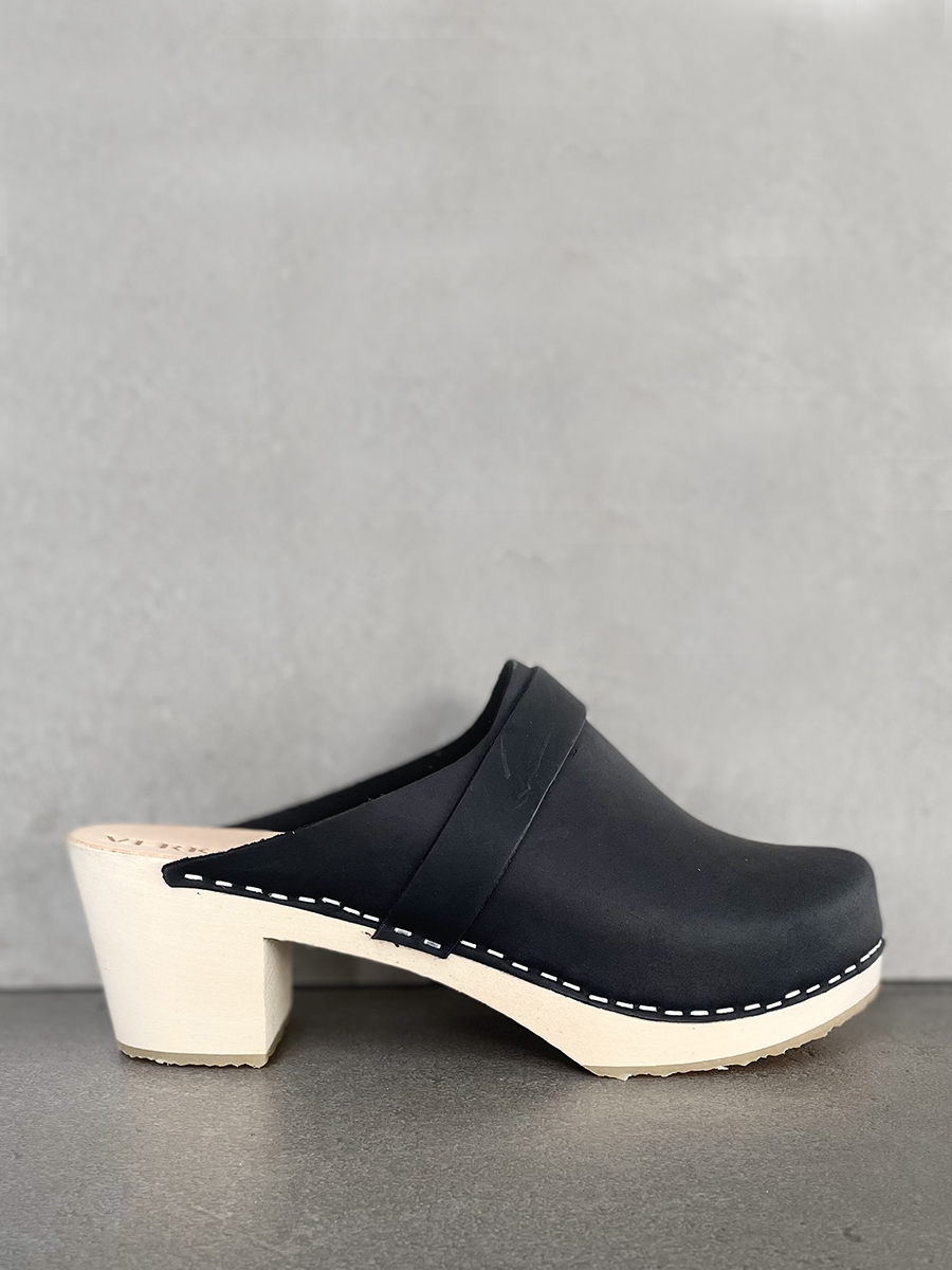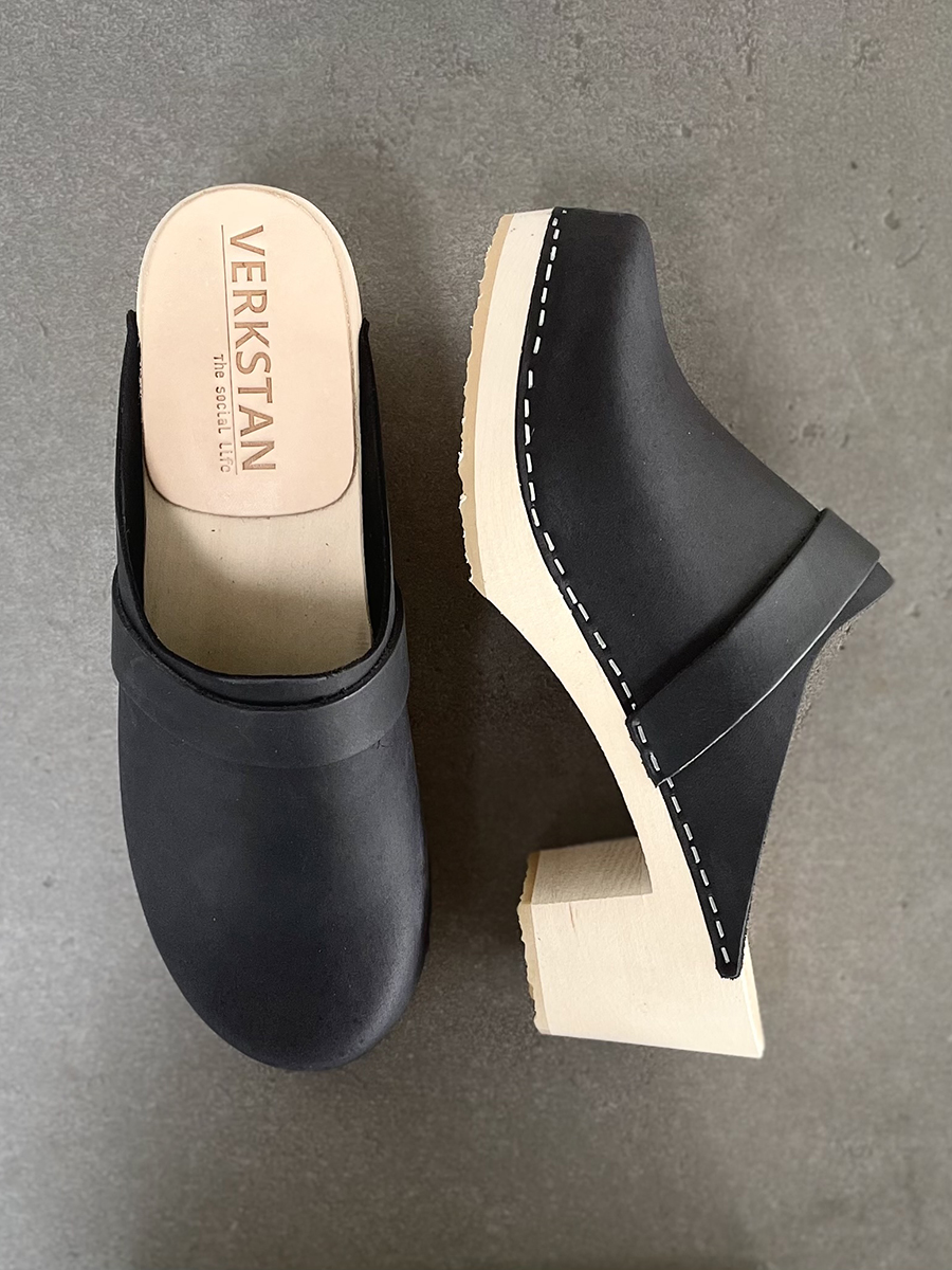 Verkstans egna svensktillverkade träskor i matt svart oljad nubuck med lite högre klack. Botten är gjord av lindträ och har en slitstark gummisula.