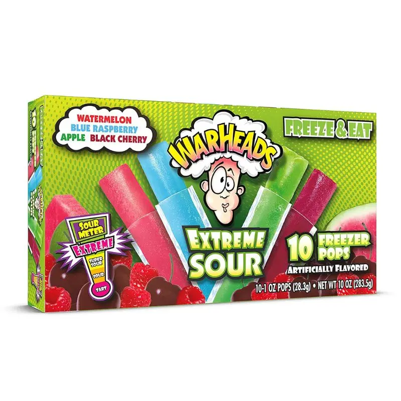 Uppmaning till alla sura-godisälskare! Dina favoritsura smaker från Warheads finns nu som smaskiga fryspoppar! Warheads Fat Free Freezer Pops 283g erbjuder fyra extremt sura och fruktiga smaker i en perfekt blandad förpackning: vattenmelon, blå hallon, svart körsbär och äpple. Varje fryspop är fettfri och packad med en saftig och sur smak som ger en svalkande och uppfriskande upplevelse – perfekt för varma dagar eller som ett roligt godissnack när som helst.